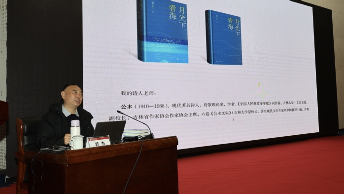 讲座伊始,郭杰教授讲述了自己作为徐州人的成长故事,快速拉近了与师生的距离,并结合四十年写作经验及诗集《月光下看海》的分享,让师生深入了解诗歌创作的理论与实践。郭杰教授强调诗歌是情感的重要载体,诗歌创作需注重具体意象的运用,在研读经典作品时要结合时代背景理解作品。