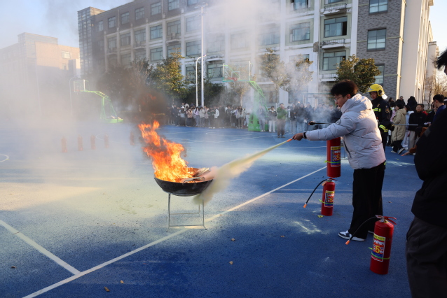 疏散集结后,参练师生来到一期篮球场。消防指战员为在场师生展示讲解了消防车内部构造和功能后,为大家讲解示范了干粉灭火器“提、拔、握、压”四步操作法和消防水带铺设、水枪喷射灭火技巧。在消防员的指导下,同学们踊跃参与实践,面对模拟火源沉着冷静完成灭火器实操,熟练掌握了灭火技能。