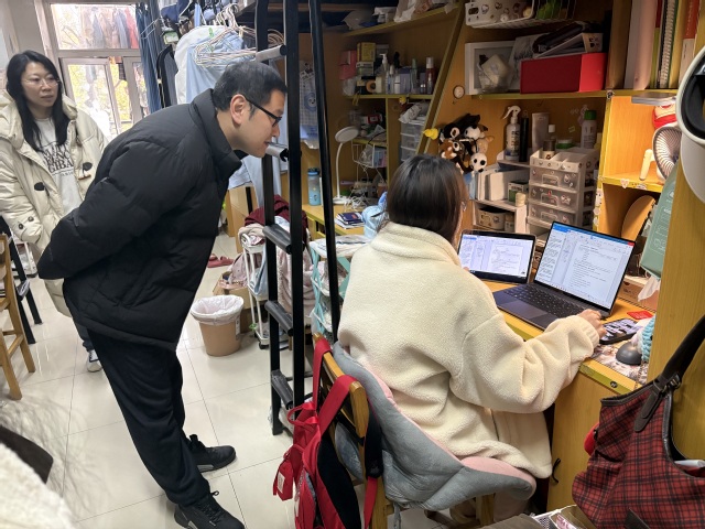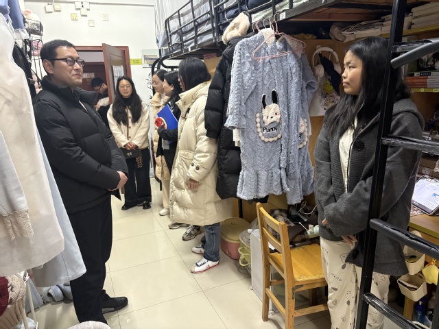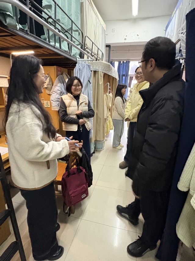 在走访过程中,陆书记与同学们亲切交谈,细致叮嘱大家注意宿舍安全与作息规律。针对同学们的学业规划,老师们耐心倾听大家关于考研、考公等方面的想法,并结合自身经验给予指导。面对刚完成转专业的新生,陆书记格外关切,详细了解大家在新专业、新宿舍的适应情况,询问相关需求。