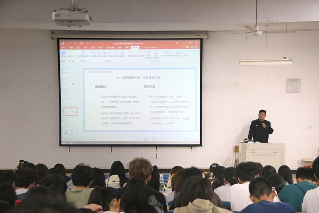 在本次活动中,大龙湖派出所王华伟警官围绕“什么是电信诈骗”“新形势下电信诈骗的演变”和“常见的诈骗手法及预防措施”等问题进行了细致讲解。结合所办理的实际案例,王警官重点就常见的兼职刷单、裸聊、网贷等多种诈骗方式向同学们进行介绍,向同学们传授了“识诈、反诈”技能,提醒所有同学要以实例为鉴,谨防上当受骗。