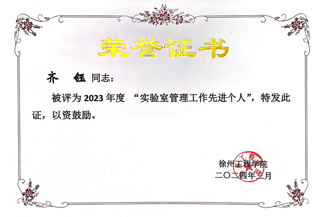 为进一步深化实验室与设备管理机制体制改革,增强实验室工作者的荣誉感和责任感,鼓舞广大实验室工作者参与到高校全员、全过程、全方位育人实践活动中,树立典型、表彰先进,公司近几年持续开展实验室工作先进集体和先进个人评选工作。齐钰老师积极探索和创新实验教学内容、手段和方法,取得了一定的理论或实践效果。在实验室建设与管理工作方面积极进取、尽职尽责,勇于探索和实践新的实验室管理模式,为提升实验室建设水平和提高实验教学、科研能力出谋划策,并做出一定成绩。工作务实,锐意创新,高质量完成实验室建设与管理高质量发展基本指标考核。