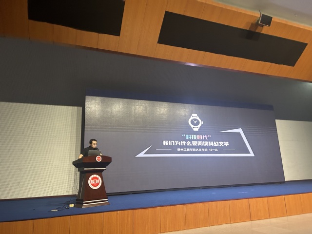 最后,同学们来到了图书馆报告厅,曹宁老师介绍了公司的基本概况和发展愿景,并欢迎大家报考bv1946伟德官网。任一江博士为同学们做了一场题为《“科技时代”我们为何要阅读科幻小说》讲座。同学们纷纷表示,在听讲座的过程中引发了他们对科幻世界层面的思考,拓宽了自己思想的领域。