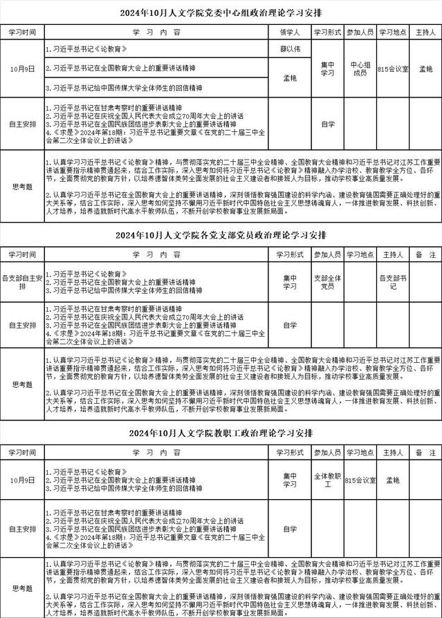 2024-2025学年第一学期10月公司党委中心组、党支部和教职工政治理论学习安排