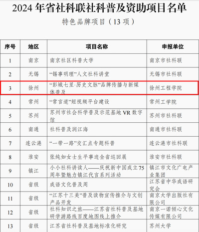 近日,江苏省哲学社会科学界联合会公示2024年省社科联社科普及资助项目名单,公司申报的“‘彭城七里·历史文脉’品牌传播与新媒体普及”项目获批特色品牌项目资助。
