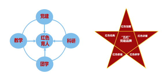 构建以红色党建为引领、红色文学课程群为特色、红色文学创作与研究为支撑、红色研学活动为路径的“四位一体”红色文化铸魂育人模式,《聚焦立德树人 传承红色基因——“四位一体”共铸红色育人格局的探索与实践》被遴选为校级教学成果奖重点培育项目。打造红色馆藏、红色讲堂、红色研学、红色歌谣、红色经典“五红”党建品牌。