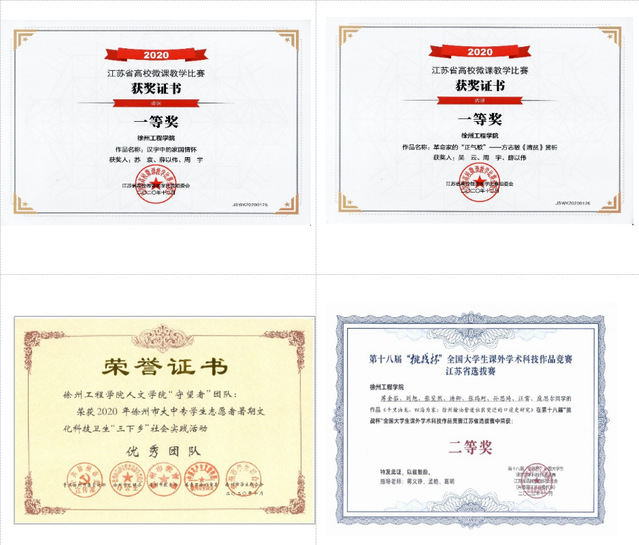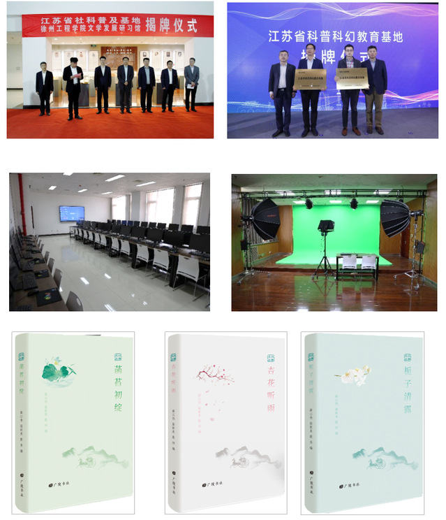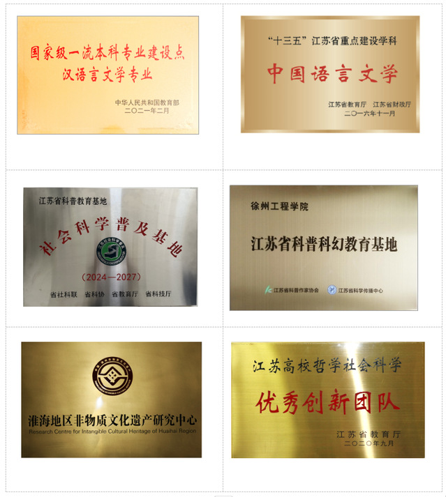 首创汉语言文学专业文化博物馆(文学发展研习馆),获批江苏省社科普及基地;创建科普科幻普及基地,获批江苏省科普科幻教育基地;由员工担任讲解员面向社会开放,接待参观者数万人次。“淮海地区非物质文化遗产研究中心”获批江苏省人文社会科学校外研究基地、江苏省首批非物质文化遗产研究基地,参与编撰出版《中国非物质文化遗产年鉴》。创建“新文科实验室”(非线编实验室、短视频创新实验室、影像采集实验室),为新媒体、数字技术类课程教学以及科研、学科竞赛等提供有力支撑。开设博雅讲堂,编辑文学期刊《东隅》。依托以上平台,教师获批国家和省社科基金各4项,获全国高校教师教学创新大赛二等奖等省级以上教学奖20余项;员工获江苏省青年科普科幻征文大赛奖100余项、“创青春”全国金奖等省级以上学科竞赛奖140余项、江苏省优秀毕业论文8篇、优秀毕业论文团队5个。出版员工文学作品集3部。