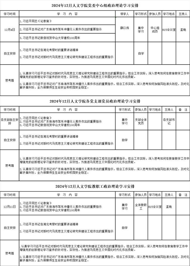 2024-2025学年第一学期12月公司党委中心组、党支部和教职工政治理论学习安排