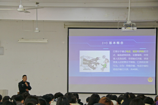 王警官开宗明义,讲述了诈骗的基本信息和发展过程,并着重指出目前老员工已经成为电信诈骗瞄准的重要群体。除常规诈骗形式外,诈骗犯通常利用老员工的幼稚心理,以代抢演唱会门票、代刷游戏等借口骗取财物。因此,当同学们遇到涉及个人财产和信息安全的情况时,必须保持警惕,切勿轻信陌生来电和信息,更不能随意透露银行账户、密码等敏感信息。宣讲的最后,王警官强调,电信诈骗是可防性犯罪,事后打击不如事先防范,叮嘱同学们下载国家反诈APP,织密反诈安全网,构建全民防火墙。