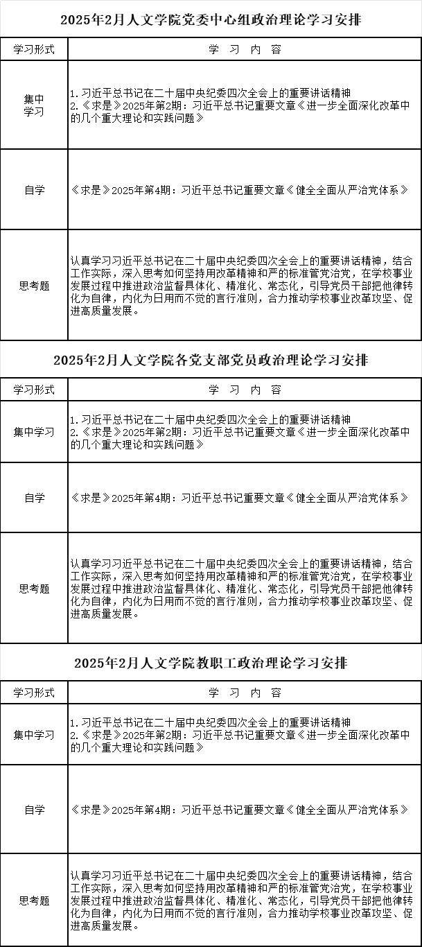 2024-2025学年第二学期2月公司党委中心组、党支部和教职工政治理论学习安排